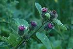 Common Burdock is a large, bushy plant with globular, prickly pink-to-lavendar flower heads, approximately 3/4 inches wide.