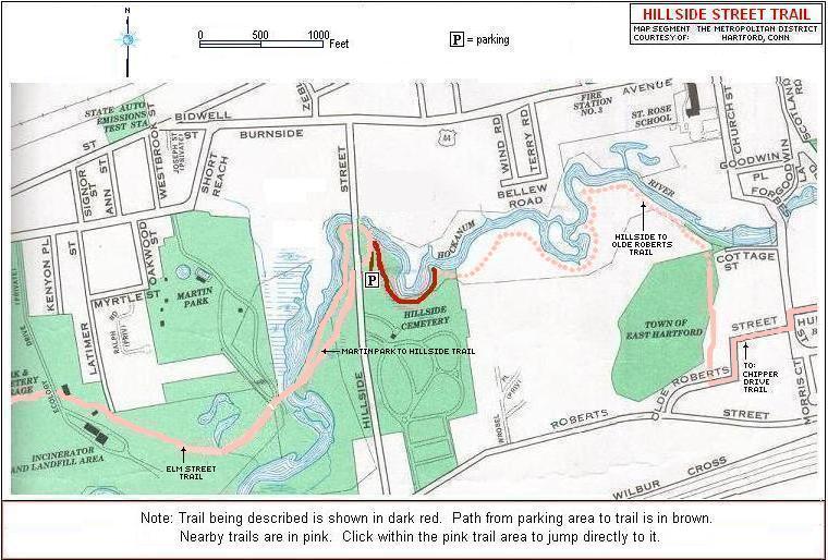 Parking and the trailhead are located on the east side of Hillside Street on the south side of the river.