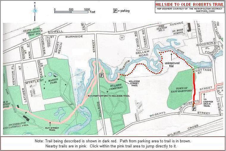 Parking and the Hillside trailhead are located on the east side of Hillside Street, on the south side of the river.